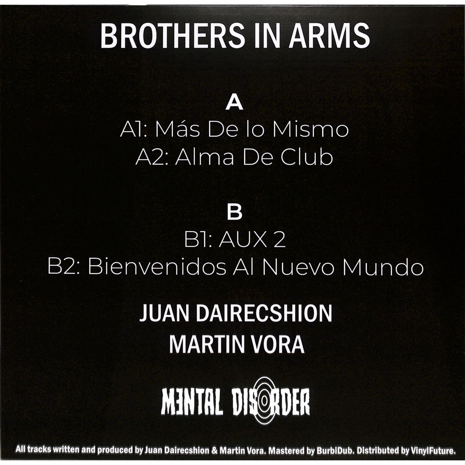 Title: Brothers In ArmsArtist: Juan Dairecshion, Martin VoraLabel: Mental Disorder CanadaGenre: Techno, Tech House, Electro, BreaksCatalog number: MD001Format: 12"Condition: Media: Near Mint / Sleeve: Near Mint