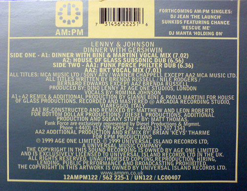 Title: Dinner With GershwinArtist: Lenny & Johnson, Bini & Martini, Funk Force, BKTLabel: AM:PMGenre: House, Garage HouseCatalog number: 12AMPM122Format: 12"Condition: Media – Very Good Plus / Sleeve – Very Good Plus