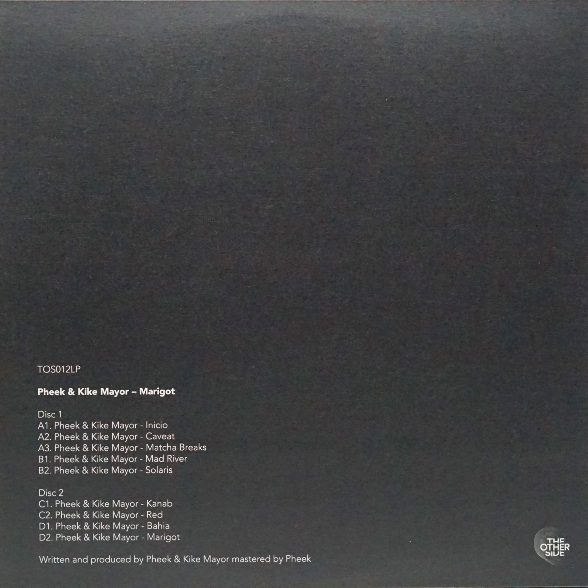 Title: MarigotArtist: Pheek, Kike MayorLabel: The Other SideGenre: Tech House, House, MinimalCatalog number: TOS012Format: 2x12"